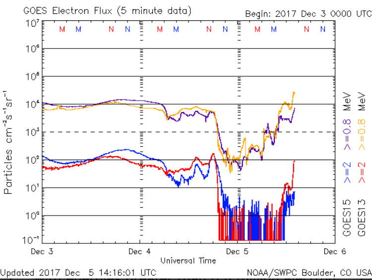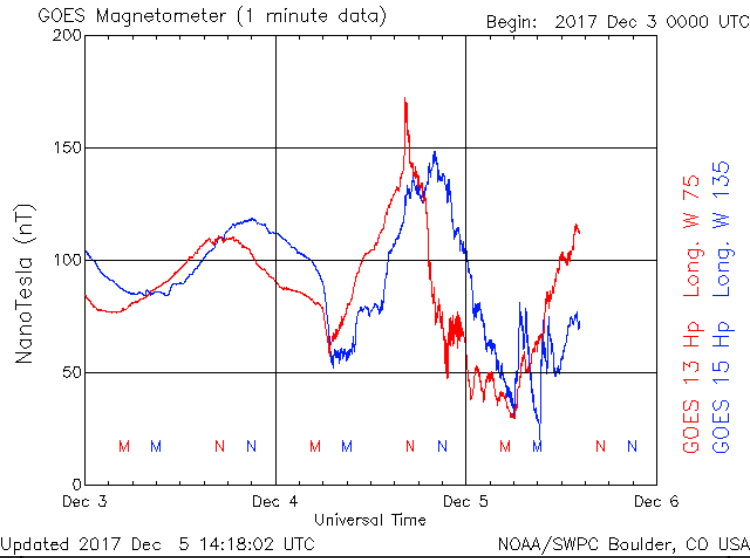 Earth’s magnetic field (or aura) has fluctuated noticeably over the past several hours, largely because a stream of wind from the sun has arrived. Per the pictures below: the electron count dropped for hours; we’re in a geomagnetic storm (currently G1); the magnetometer reading went a bit haywire; and solar wind speed is elevated (normal is about 350km/sec).