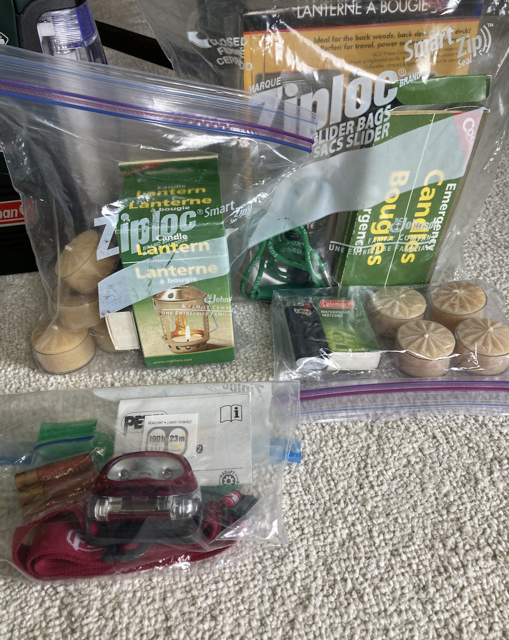 I group items together in plastic baggies, with the labels facing outward. This way, in an emergency, I can grab the baggie I need, and I know exactly what’s in it. It makes it easier to store in my large go-bag, too.